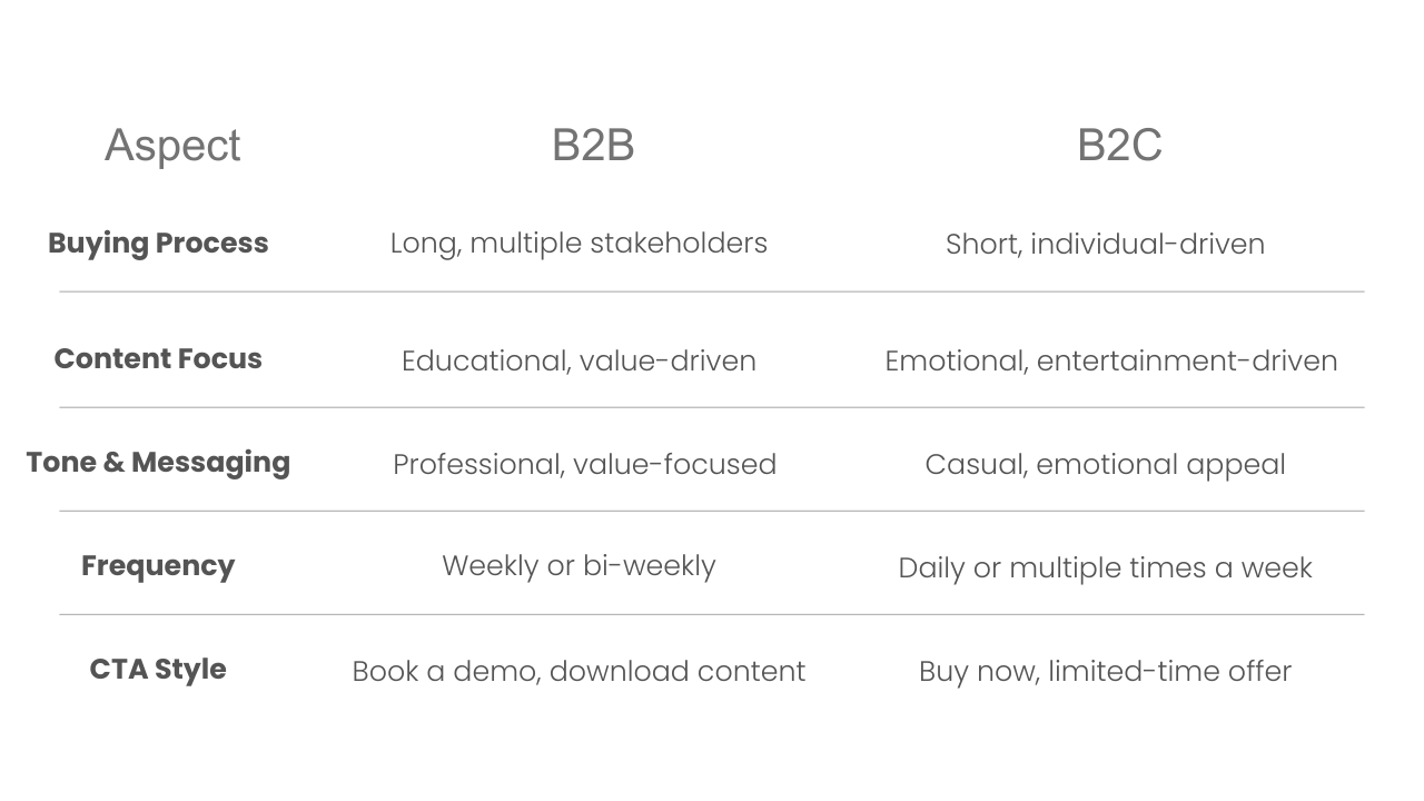 B2B emails offer thought leadership, case studies, whitepapers, and ROI-focused insights.