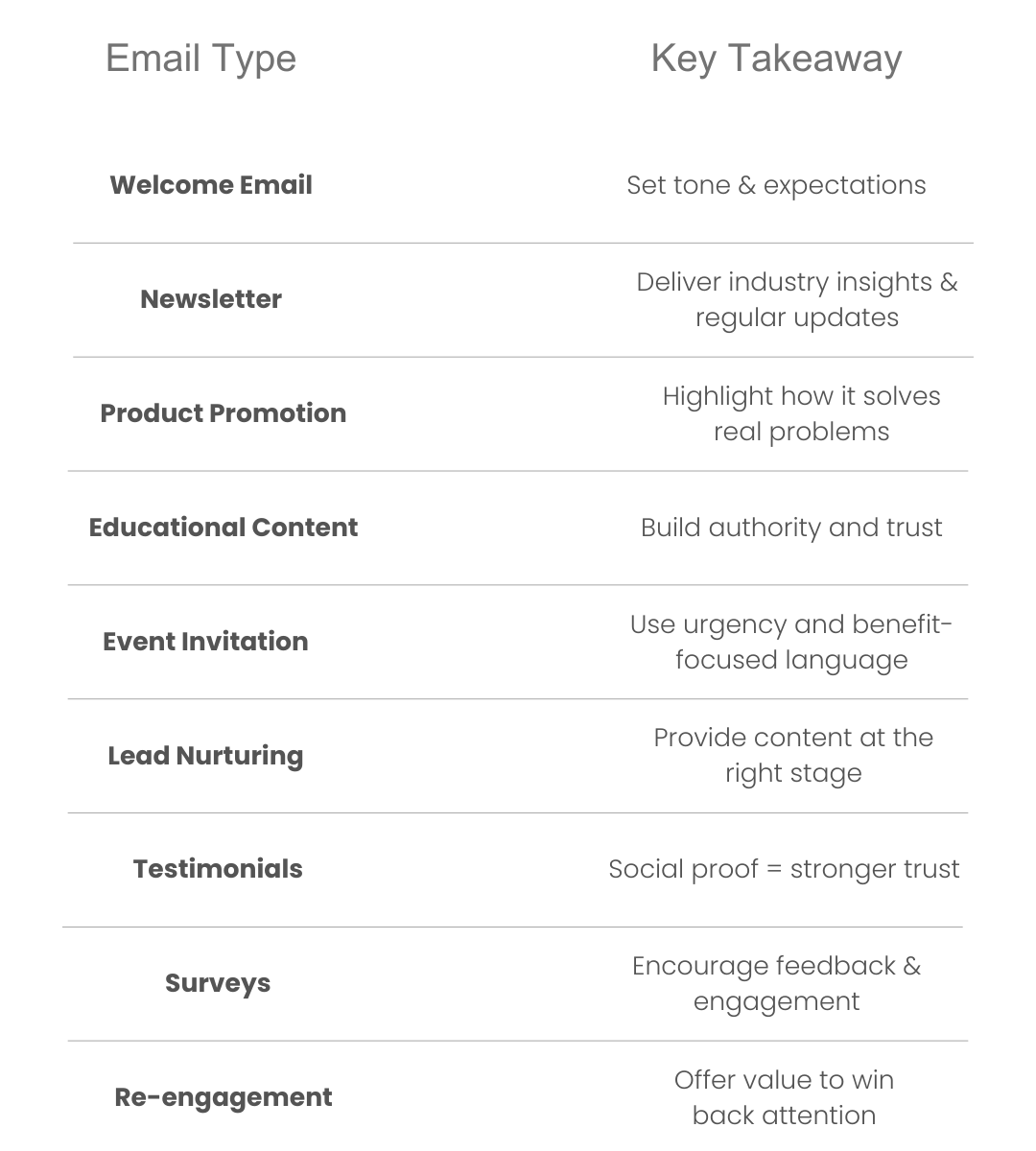 - Segment email lists based on industry, job role, or buyer journey stage for targeted messaging and better results.
